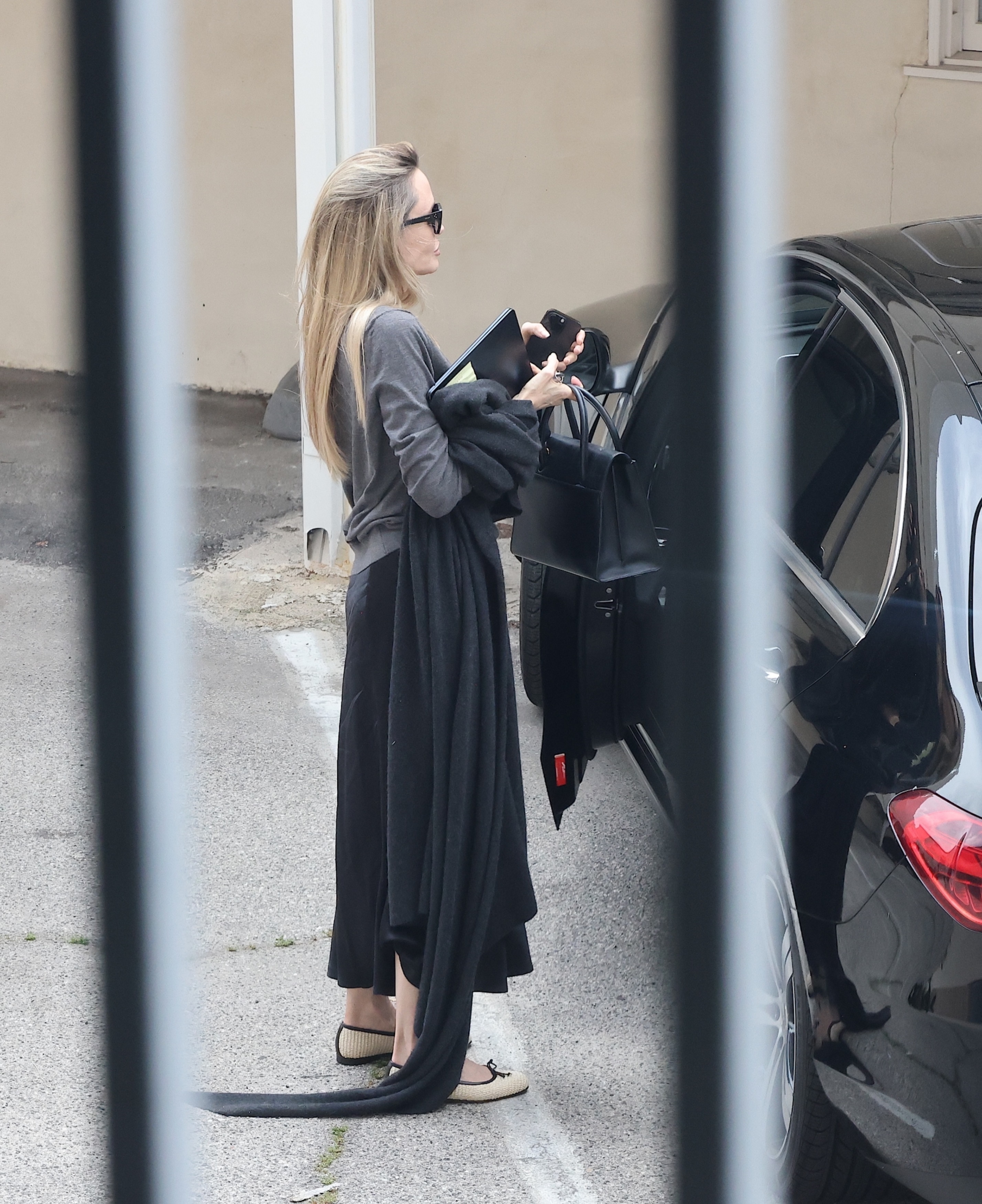 Aos 49 anos, Jolie desembarcou de seu veículo exibindo um visual sofisticado e discreto, apostando em um suéter cinza e uma saia longa preta, complementados por sapatilhas creme e óculos de sol.